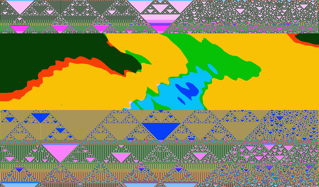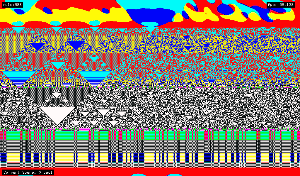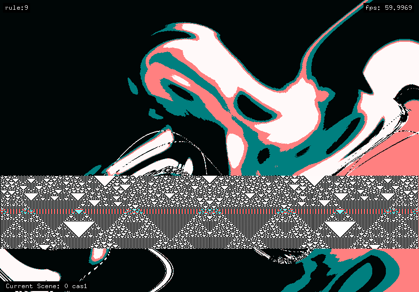 To move thorugh the scenes use the left and right arrow keys. The down key will stop the scene from running, and the up key will reload the scene at the same point it was at. The 'a' key will change the rule generating the cellular structure. The 'd' key will toogle display of the current framerate, rule and scene. The 'p' key will pause the current scene and hitting 'p' again will resume the scene, but not reload the scene. In any of the three scenes keys 1 through 0 on the keyboard will add glitch effects to the scene and keys q through u will effect the color of the scene. The 's' key can be used to take a screenshot in any scene to save your generative glitch art!